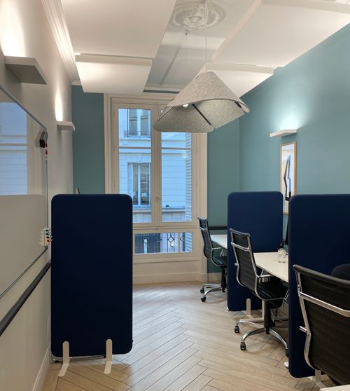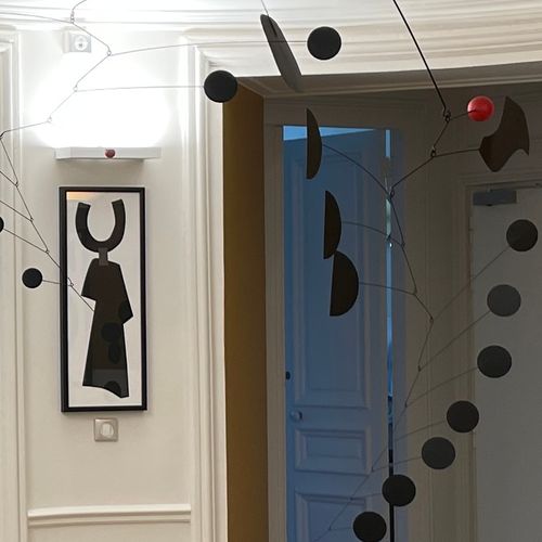 Un mobile grand format est placé au point névralgique des locaux. S’inspirant des codes du minimalisme et de l’abstrait, comme le ferait Alexander Calder. Il sert de point de repère au sein des locaux.