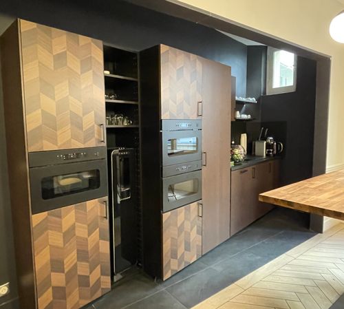 Pour les espaces communs, il y a un jeu de contrastes avec une structure à l’effet dégradé, complétée par un mobilier travaillé : fauteuils modernes en plexiglas, tables aux pieds en bois tourné, et façades de cuisine marquetées.